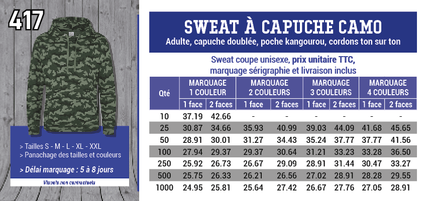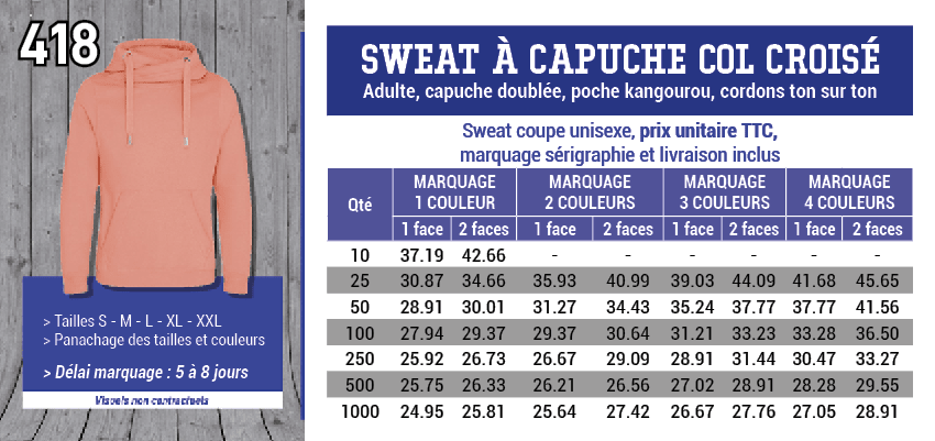 Grammage : 280 grs - Composition : 80 % coton 20 % polyester - Coton doux - Awdis