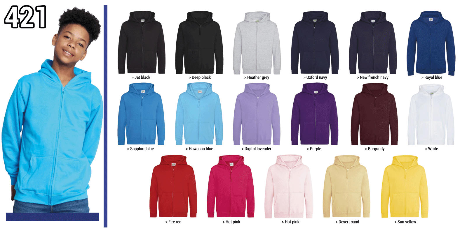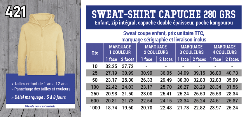 421 - Sweat à capuche zippée enfant Grammage : 440 grs - Composition : 70% coton Ringspun/20% polyester/10% polyester recyclé